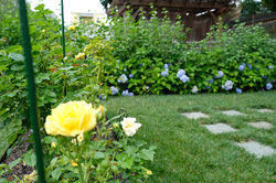 The goal of this landscape design and build project was to create two patios in an elongated yard in Cambridge, MA. The main patio features a concrete Techoblock paver for dining and entertaining. A secondary patio made of reclaimed bluestone at the rear of the yard is set in lawn. The two spaces complement each other and are separated by a new cedar wood shed, vegetable garden, and a rose garden. Blue hydrangeas, daylilies, tall grasses and a mix of perennials make this garden an oasis near Harvard Square. Designed and built by Skyline Landscapes.